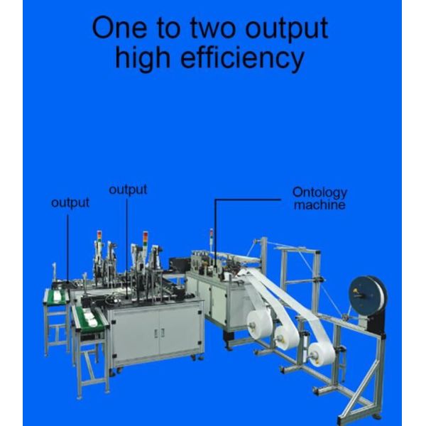 This production line is a fully automatic one-to-two mask machine, one body machine drives two ear band machines. After the main body machine